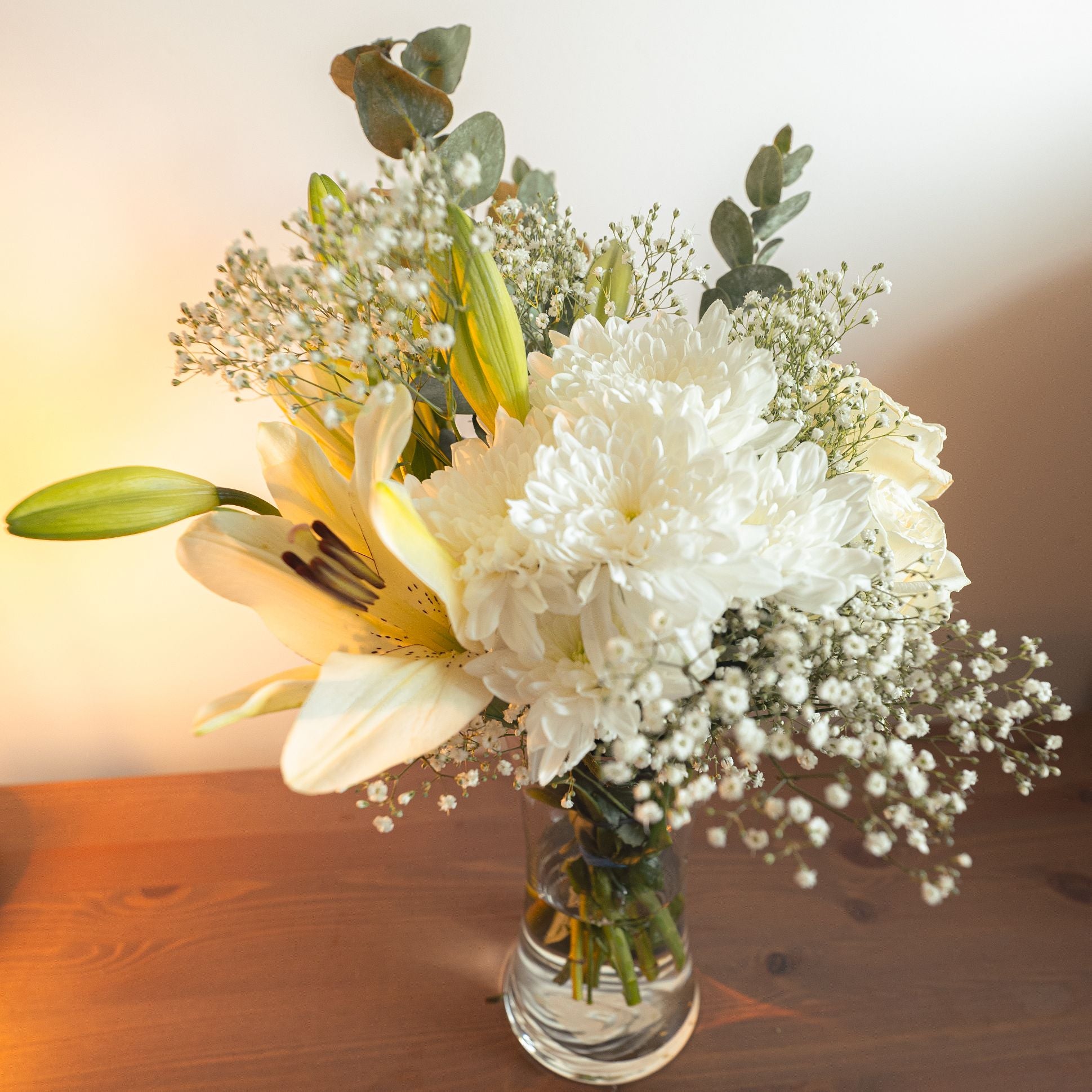 Named after the goddess of hearth and home, the Hestia Bouquet offers a serene expression of sympathy and warmth. Featuring white lilies, mums, elegant white roses, baby’s breath, and soothing eucalyptus, this arrangement brings a quiet sense of peace and grace to moments of loss.